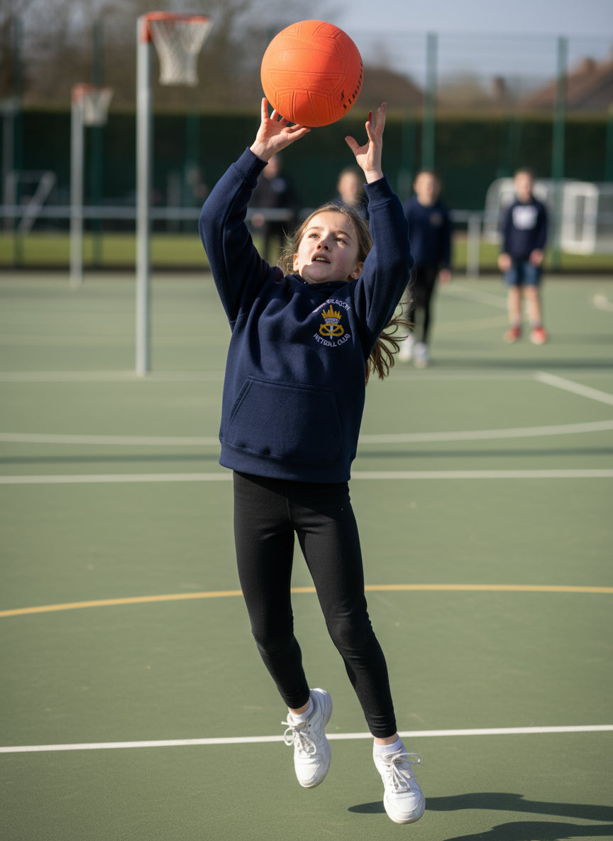 An over the head hoodie in oxford navy with the Barr Beacon NC logo embroidered on the left chest and Barr Beacon Netball Club printed on the back.