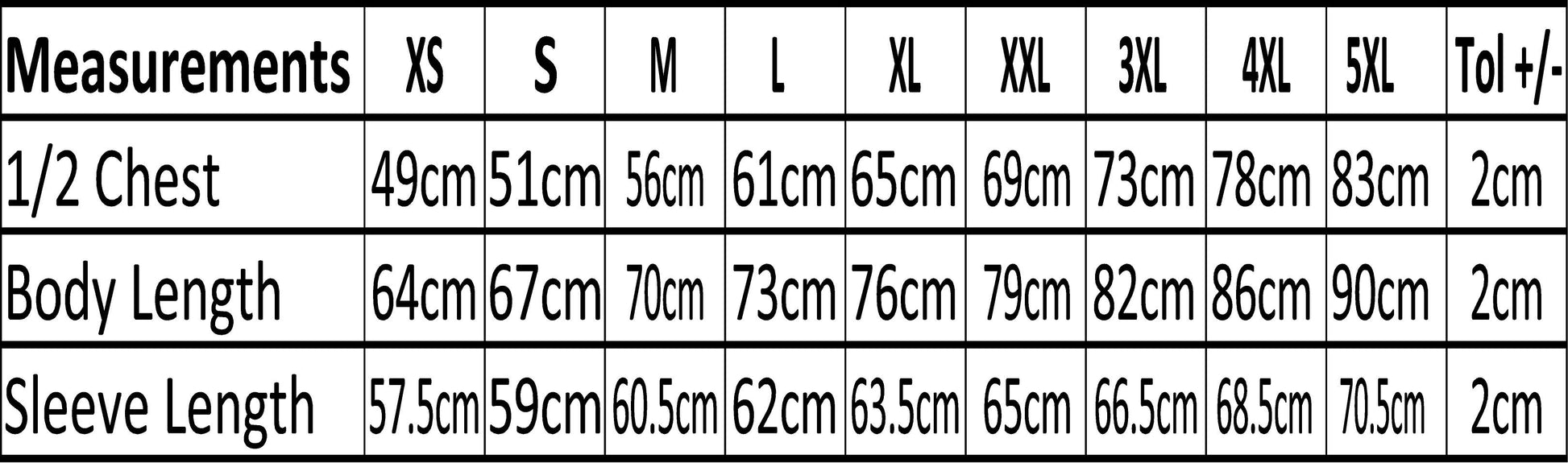 XSmall - 36" (longer arms & body than Age 12/13) Small - 38" Medium - 40" Large - 44" XLarge - 48" 2XLarge - 52"